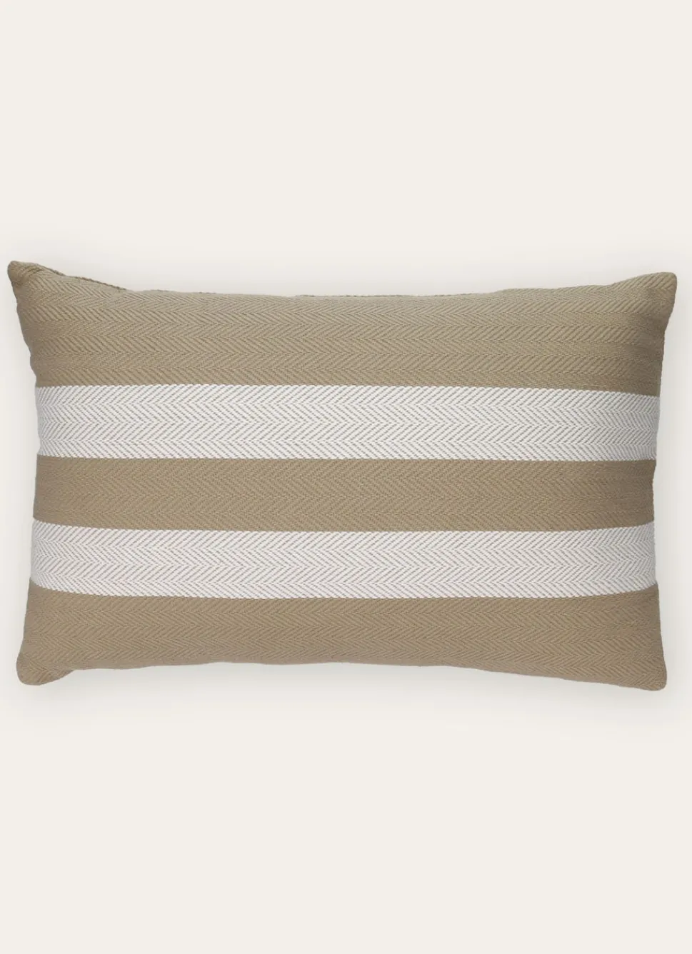 Coussin en coton avec deux larges rayures horizontales contrastées et un tissage chevron discret en fond. Déhoussable et livré avec son intérieur en polyester, il apporte une touche graphique et naturelle à votre déco.Dimensions (cm) : 35 x 55. Certification : OEKO-TEX.
