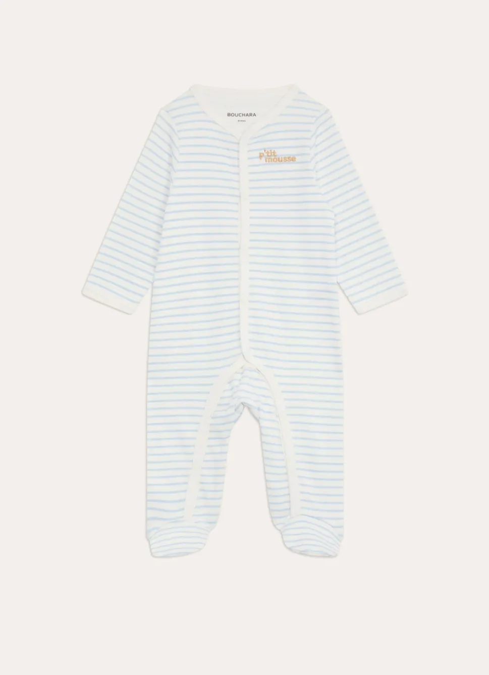Habillez votre petit matelot avec cette charmante grenouillère à manches longues en coton interlock rayée, ornée d’une broderie « p’tit mousse » sur la poitrine. Facile à enfiler grâce à ses boutons-pression sur toute la hauteur et à l’entrejambe, ce modèle est idéal pour les premières nuits de bébé. Certifiée Oeko-Tex®, elle est respectueuse de la peau sensible des nourrissons et de l’environnement. Disponible de 1 mois à 23 mois.