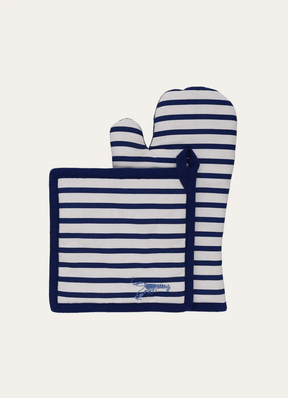 Lot de gant et manique en coton imprimé d’une rayure marinière et d’un homard. Produit certifié Oeko-tex. Dimensions (cm) : 17 x 33
