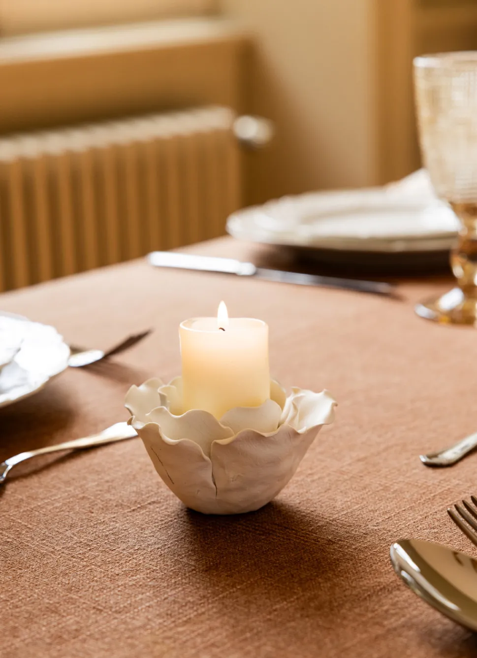 Photophore en grès pour bougie chauffe-plat. Forme fleur. Dimensions (cm) : 10 x 10 x 5.