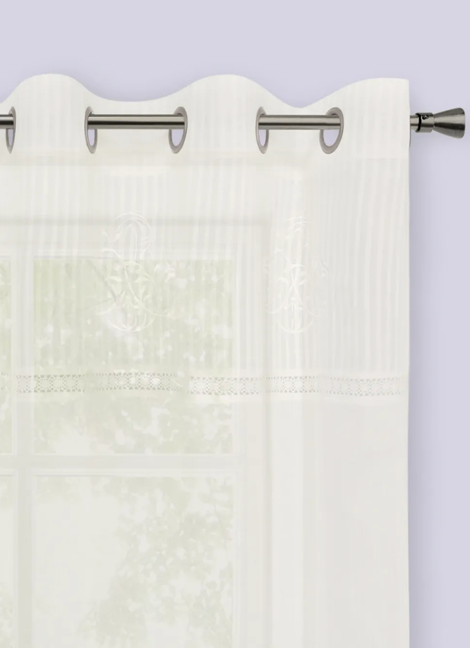 Voilage ivoire ajouré et brodé. Délicat et raffiné, ce voilage laisse passer la lumière. Oeillets argentés mats. Dimensions (cm) : L140 x H300