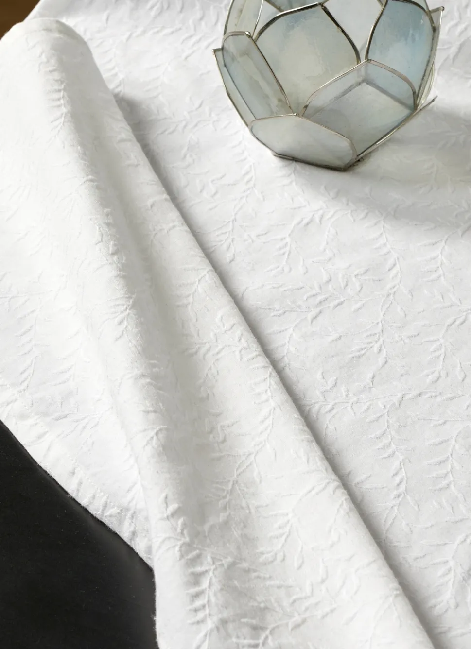 Nappe jacquard, motif floral. Produit certifié Oeko-Tex®. Jaquard 185g/m². Poids du produit finiI: 631gr. Dimensions (cm) : 180.