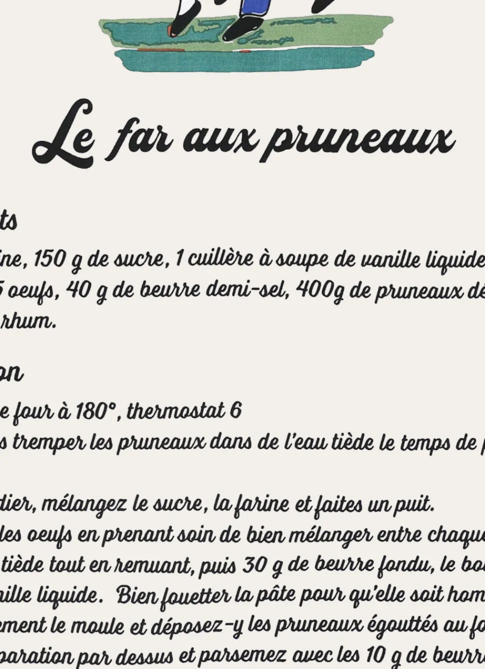 Torchon en coton imprimé style faïence avec la recette du far breton. Produit certifié Oeko-Tex. Dimensions (cm) : 50 x 70