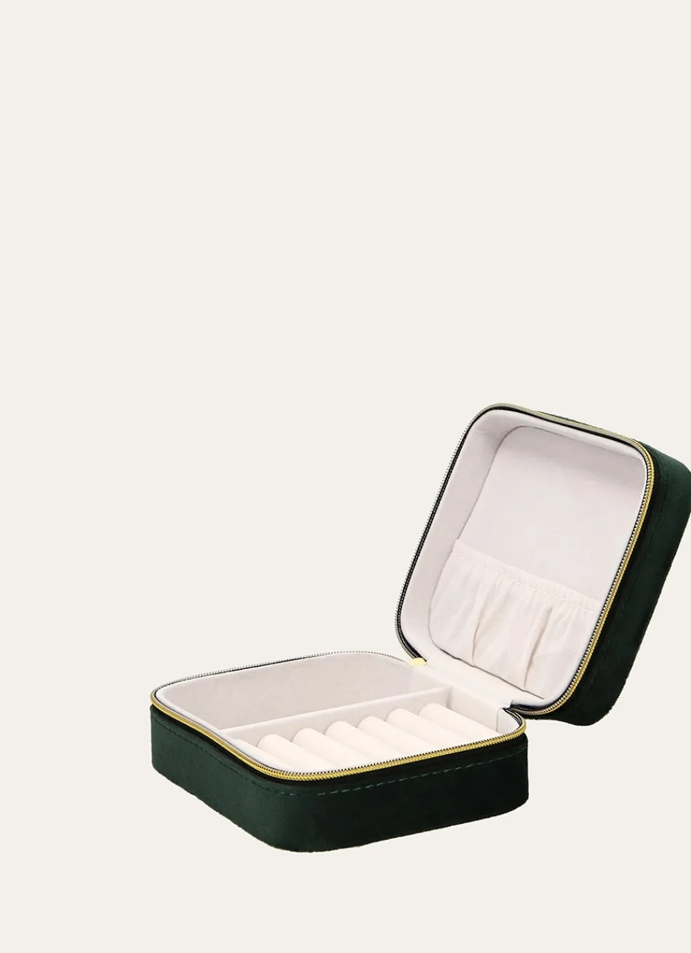 Petite boite à bijoux en tissu avec fermeture à glissière dorée et différents compartiments. Idéal pour partir en week-end ou en voyage. Dimensions (cm) : H5 x L12,5 x P10,5