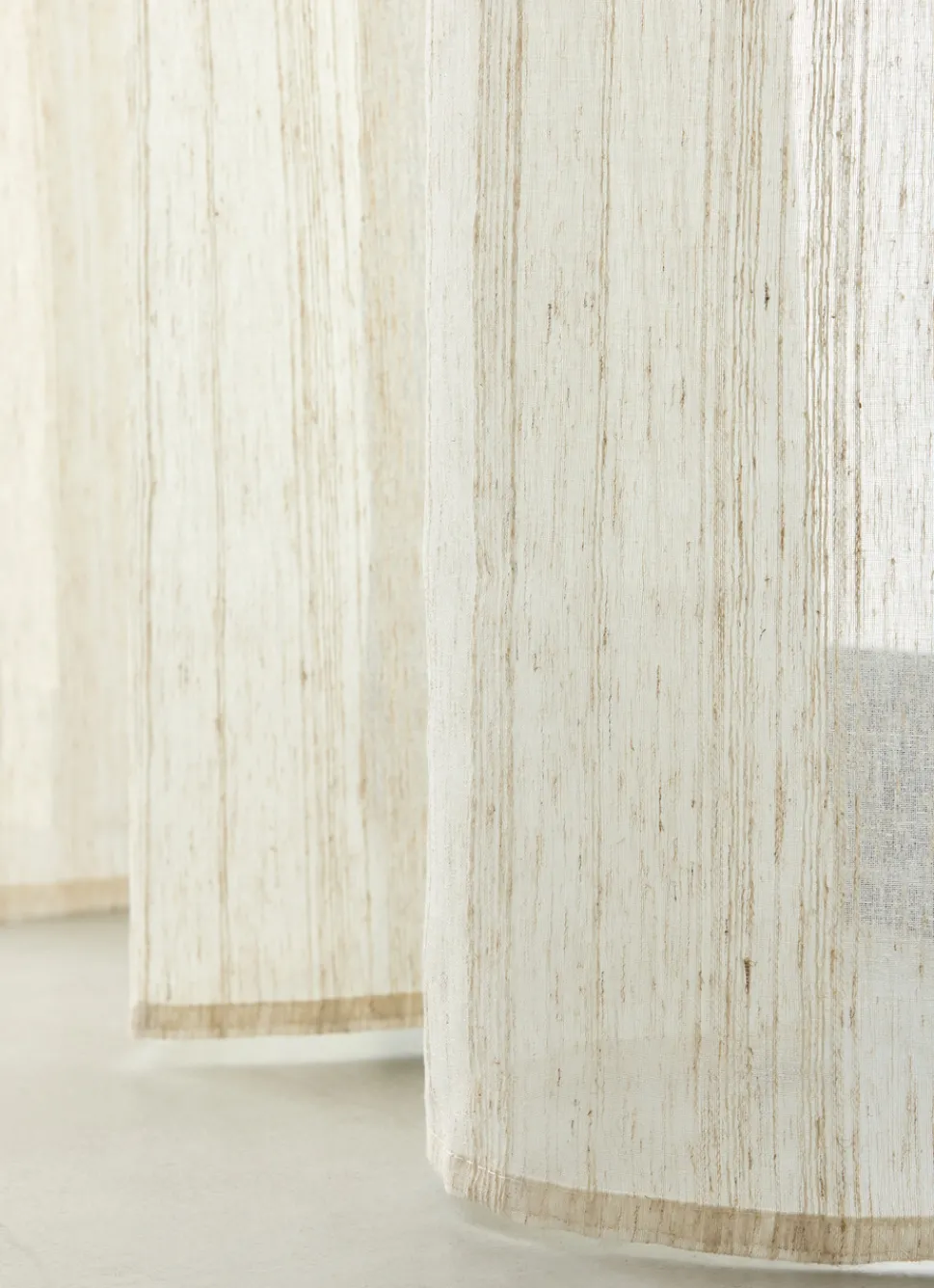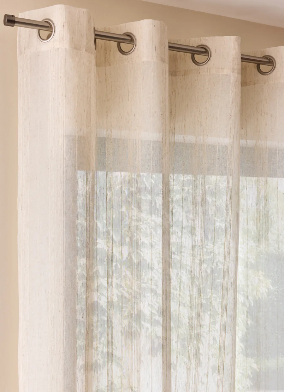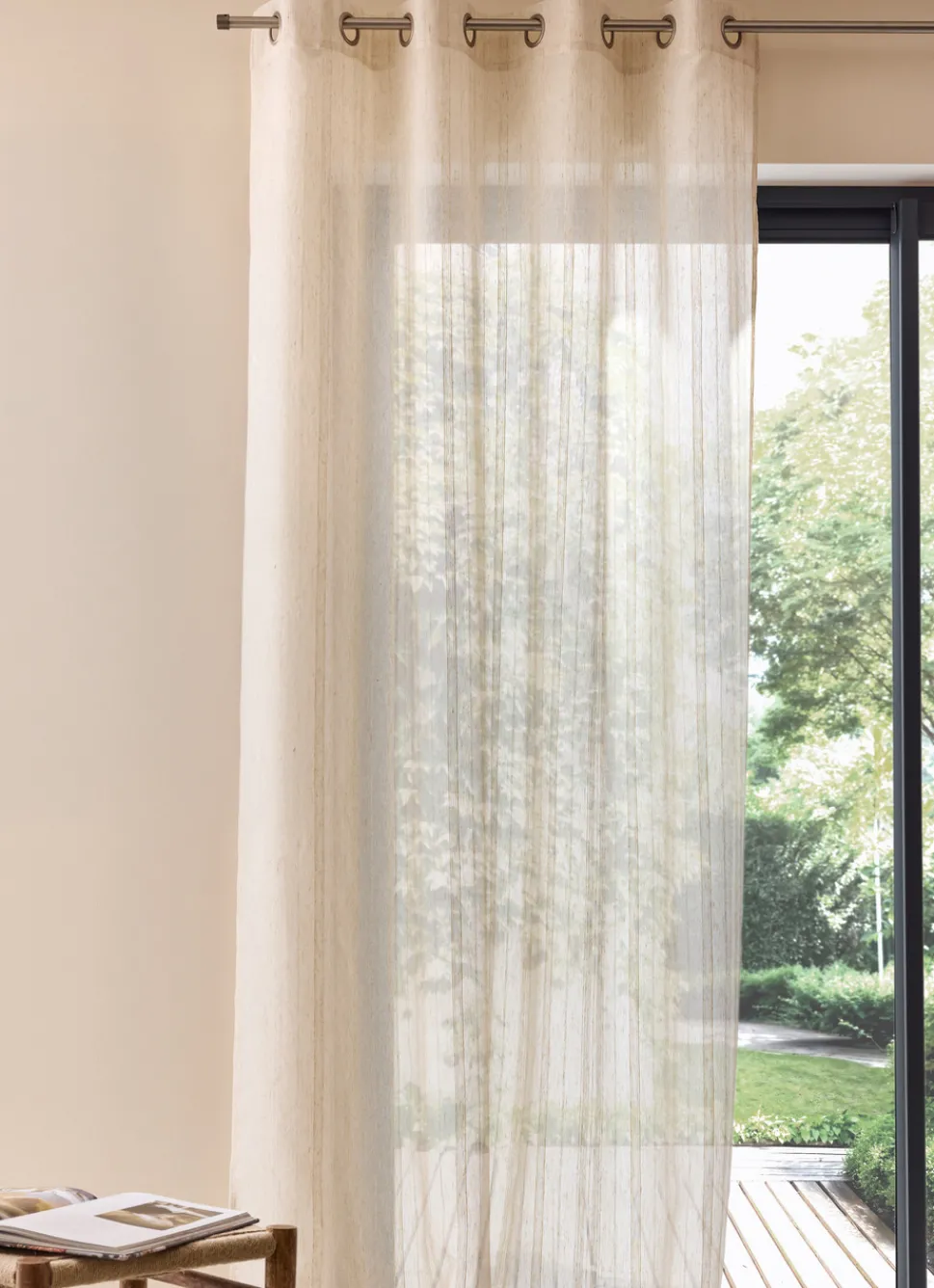 Ce voilage au délicat effet moucheté, combiné à des rayures fines en jacquard irrégulières, apporte un style chic et rustique à votre intérieur. Tamisant, il préserve votre intimité tout en laissant passer la lumière. Ce rideau est fabriqué avec des matériaux certifiés Oeko-Tex, garantissant l’absence de substances nocives. Vendu à l’unité. Dimensions (cm) : 140 x 260. Finition : Œillets argent mat (diamètre 40 mm).