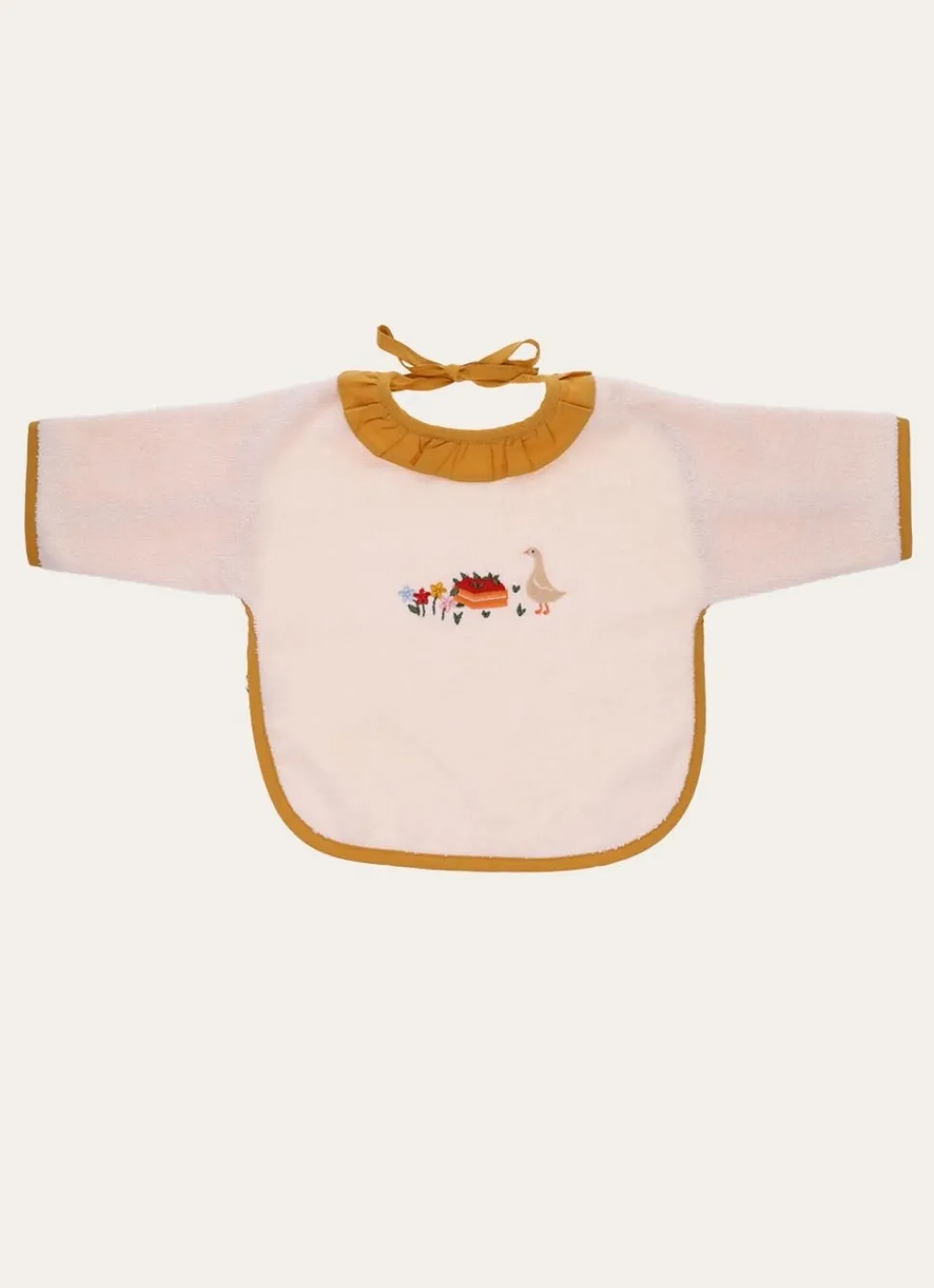 Apportez confort et protection aux repas de votre bébé avec ce ravissant bavoir à manches longues en éponge bouclette, orné d’une délicate broderie. Facile à enfiler, il se noue dans le dos pour protéger efficacement les vêtements et garder votre enfant au sec tout au long des repas.Certifié OEKO-TEX®.