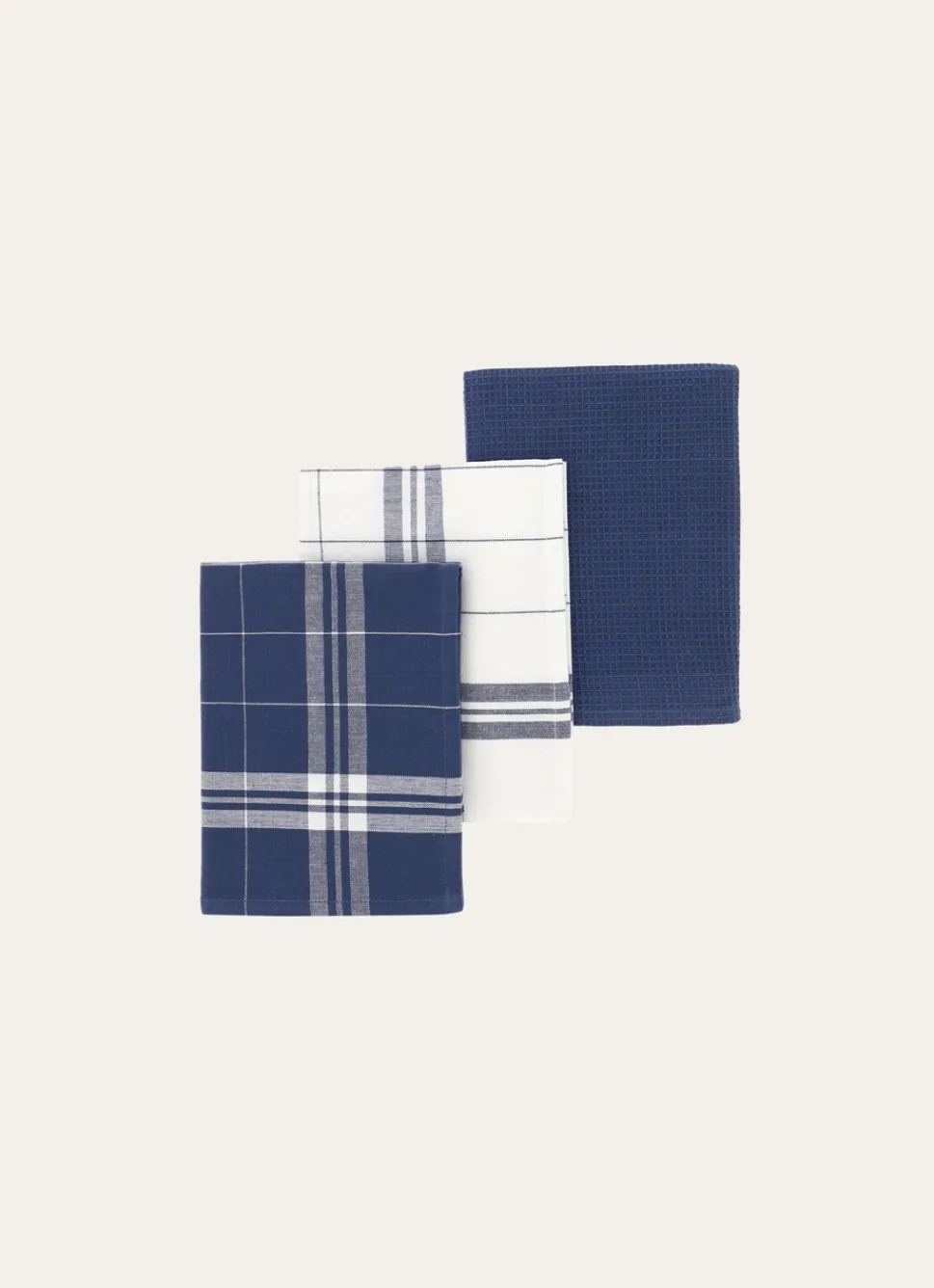 Lot de 3 torchons en coton : 2 à carreaux, tissés fil-teint et 1 torchon uni en nid d’abeille. Dimensions (cm) : H70 x L45. Existe en plusieurs coloris.