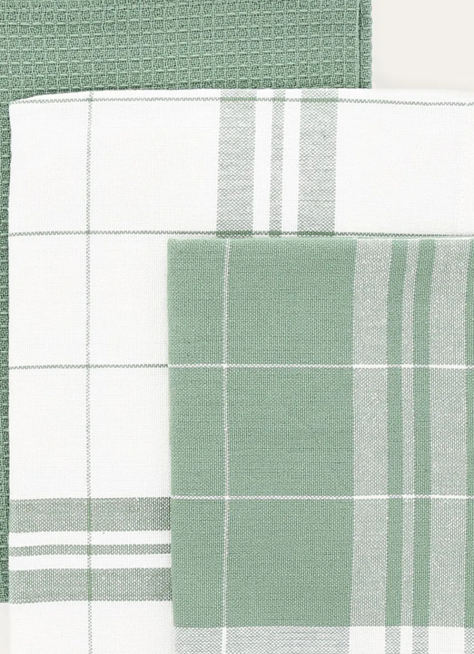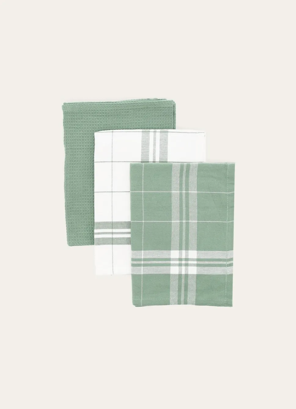 Lot de 3 torchons en coton : 2 à carreaux, tissés fil-teint et 1 torchon uni en nid d’abeille. Dimensions (cm) : H70 x L45. Existe en plusieurs coloris.