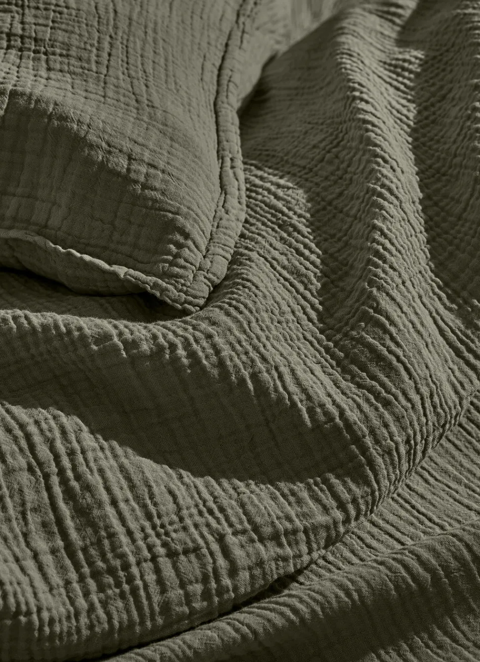 La gaze de coton est une étoffe très fine, appréciée pour sa douceur, sa légèreté et son effet brut, à l’esprit naturel. Son tissage de fils écarts, croisés, rendent ce tissu lâche, léger et légèrement transparent. Pour le linge de lit, plusieurs couches de gaze superposées en font un tissu plus robuste et opaque. La gaze de coton est un indispensable de la maison grâce à sa facilité d’entretien et son grand confort. Son apparence naturellement froissée, gaufrée et sa douceur s’accentuent au fur et à mesure des lavages.