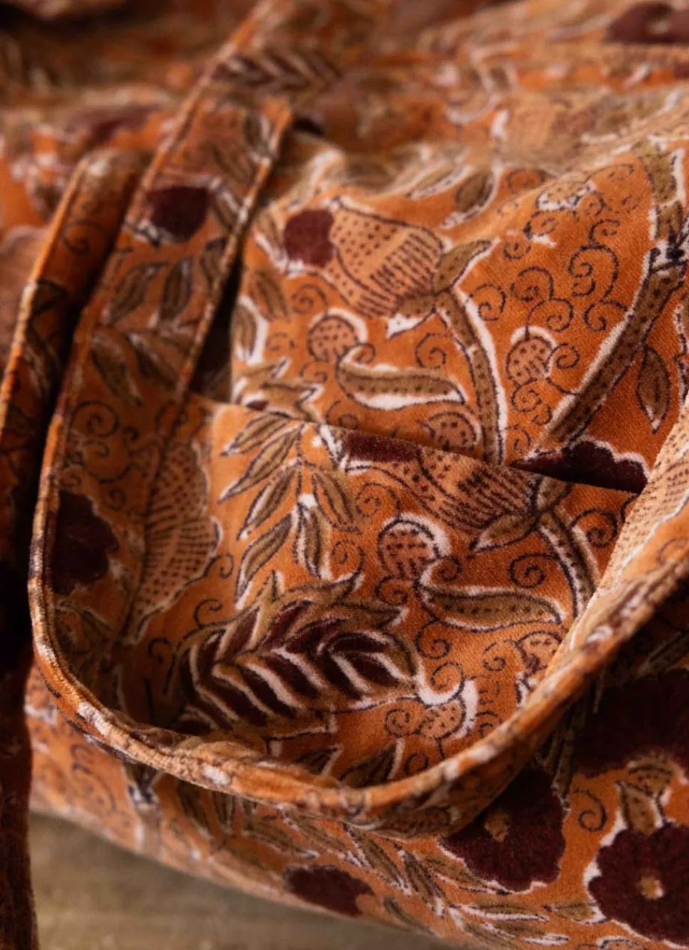 Préparez vos escapades avec style grâce à ce sac weekend en velours, sublimé par un motif floral aux teintes automnales. Ses couleurs chaleureuses et naturelles évoquent les promenades en forêt et les week-ends cocooning. Confectionné en 100 % coton, il est renforcé par un garnissage en polyester pour une tenue souple et résistante. Avec ses dimensions généreuses, il offre un bel espace de rangement tout en restant compact et facile à transporter. Idéal pour une virée de saison ou un court séjour, il s’associe avec la pochette à bijoux et la trousse grand format pour un ensemble chic et coordonné. Dimensions (cm) : H25 x L51 x P22.