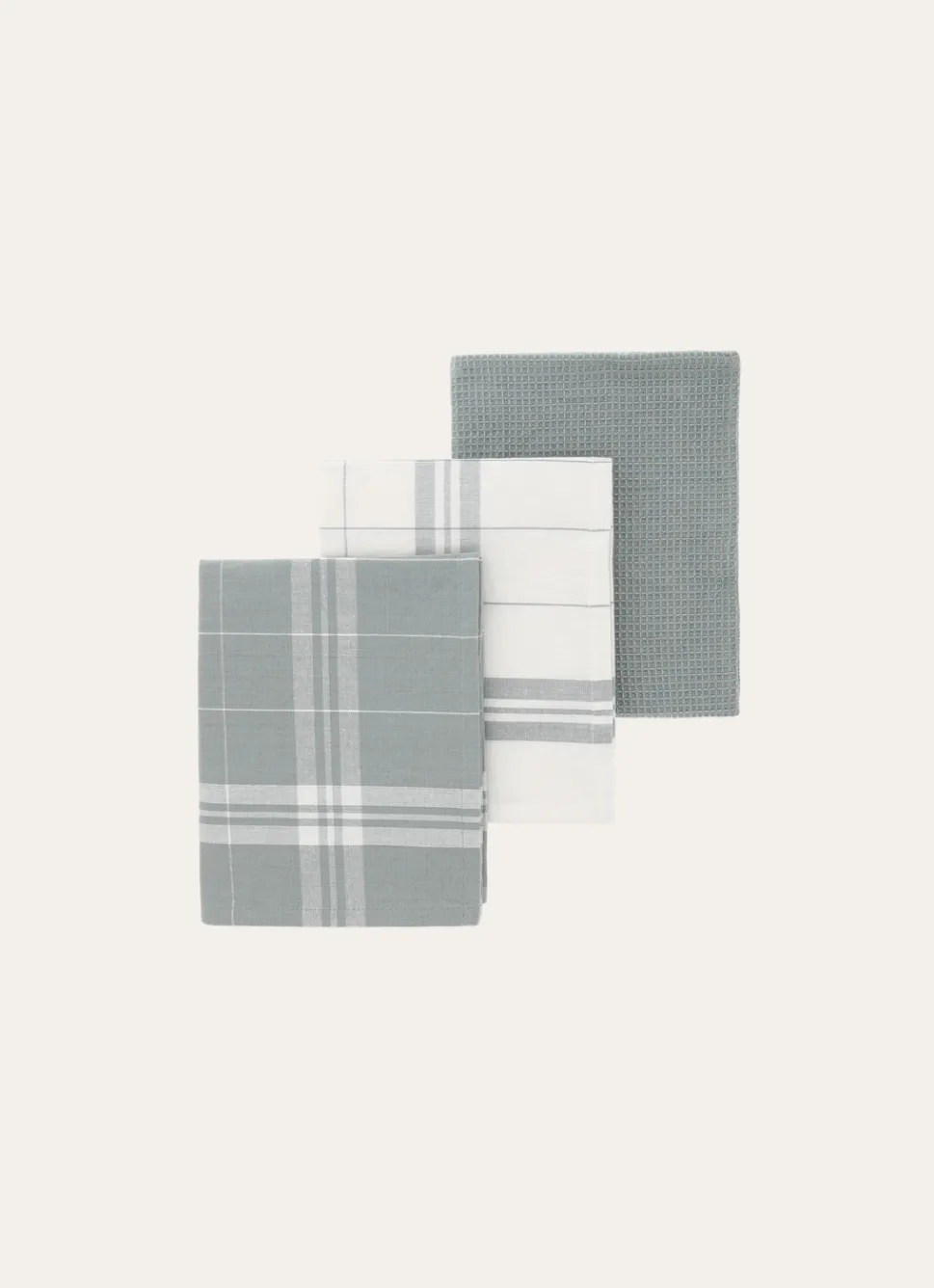 Lot de 3 torchons en coton : 2 à carreaux, tissés fil-teint et 1 torchon uni en nid d’abeille. Dimensions (cm) : H70 x L45. Existe en plusieurs coloris.