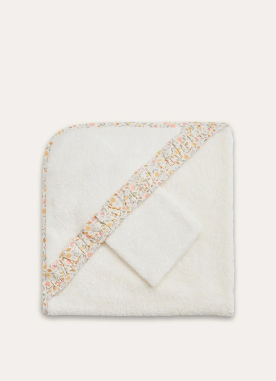 Set avec une cape de bain avec un volant en tissu à fleurs et un gant en éponge avec un biais à fleurs. Aussi adorable que confortable, ce set sera un cadeau de naissance idéal.Grammage : 360 gsm. Produit certifié Oeko-Tex®. Dimensions (cm) : 75 x 75 + 15 x 21