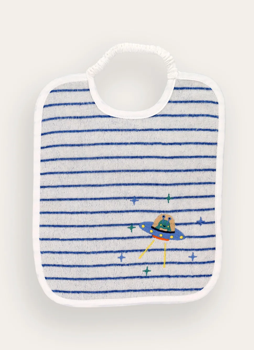 Ajoutez une touche de fantaisie aux repas de bébé avec ce bavoir en éponge douce (320 g/m²), décoré d’une adorable broderie extra-terrestre. Son col élastiqué permet un enfilage facile et un maintien confortable, idéal pour les tout-petits. Pratique et absorbant, il protège efficacement les vêtements tout en respectant la peau sensible de bébé. Certifié OEKO-TEX®, il garantit une utilisation saine et responsable. Dimensions (cm) : H32 x L26.