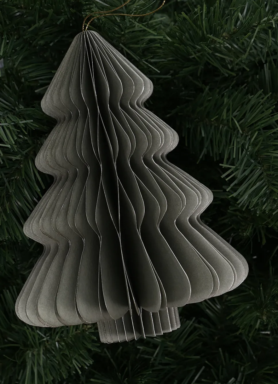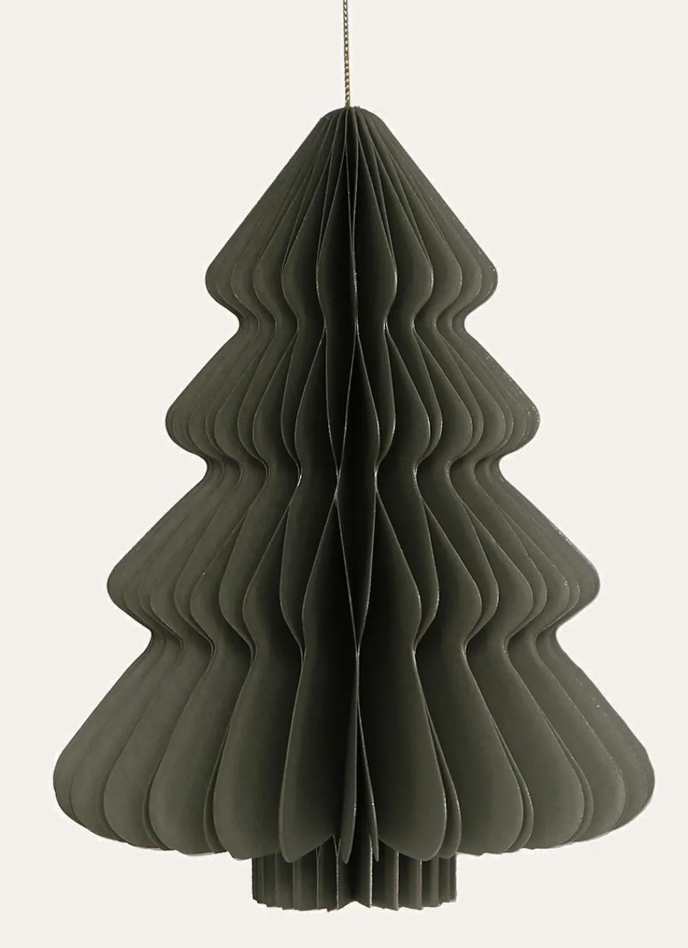 Cette magnifique suspension de Noël réalisée en papier certifié FSC®, dévoile une silhouette de sapin finement plissée, ornée de paillettes couleur champagne sur les bords. Parfaite pour sublimer un centre de table ou décorer votre sapin, elle apporte une touche de poésie et de magie à votre décoration de fêtes. Facile à monter et à démonter grâce à sa fermeture magnétique, elle est également pratique à ranger et à réutiliser chaque année. Existe en plusieurs coloris. Dimensions (cm) : H20 x D15