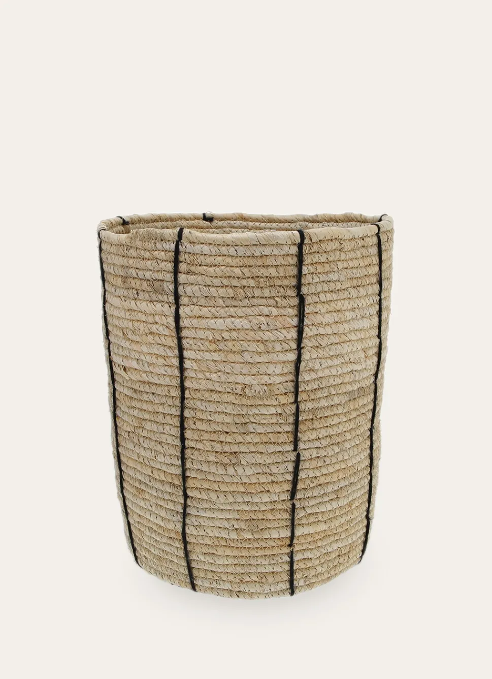 Panier en fibres de maïs tressées, rehaussé de lignes noires verticales en coton pour un style élégant et naturel. Idéal pour le rangement ou comme objet déco, il s’intègre parfaitement dans toutes les pièces de la maison. Existe également dans une taille plus petite pour créer un bel ensemble harmonieux. Dimensions (cm) : Haut. 33 x Ø haut 28 x Ø base 24.