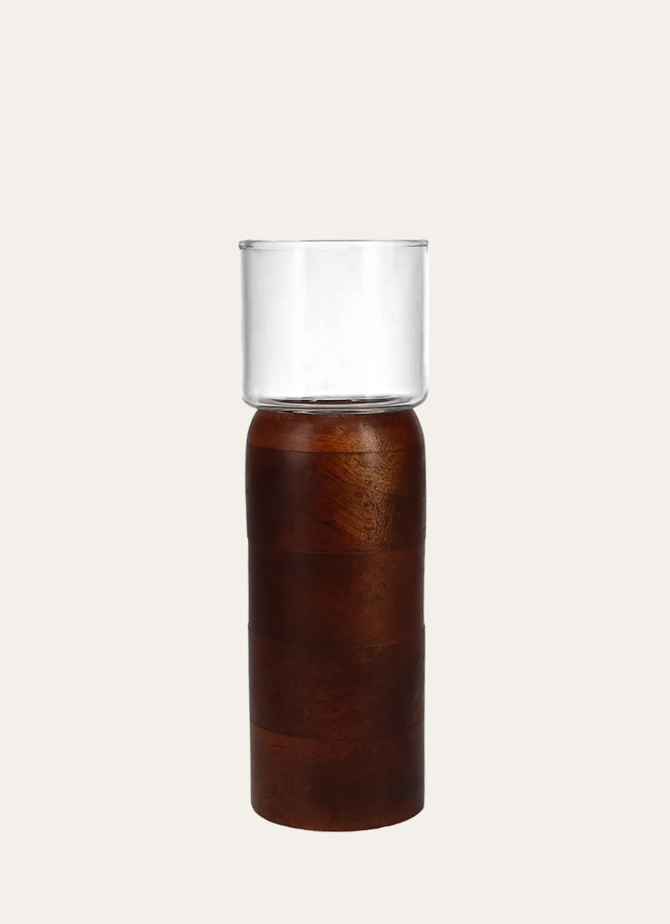 Grand bougeoir avec base en bois de manguier et photophore en verre transparent. Les deux parties s’emboitent et peuvent se séparer facilement. Il se marie harmonieusement avec le petit bougeoir réf. I8111MANG014 de la même collection, offrant une lumière douce et apaisante. Dimensions (cm) : H24 x D7,5