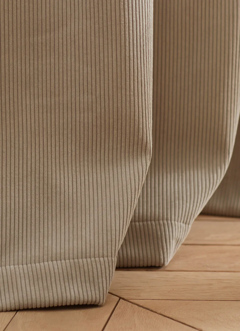 Rideau tamisant uni en velours côtelé. Ce rideau thermique et obscurcissant au tomber parfait ajoutera un effet chaleureux et cosy à votre intérieur. Finition : 8 oeillets ronds en coloris argent mat avec un diamètre intérieur de 4 cm. Décliné en plusieurs coloris. Doublure polaire noire pour les modèles terracotta et noir, et blanche pour le modèle perle. Certifié OEKO-TEX® STANDARD 100. Dimensions (cm) : H260 x L135