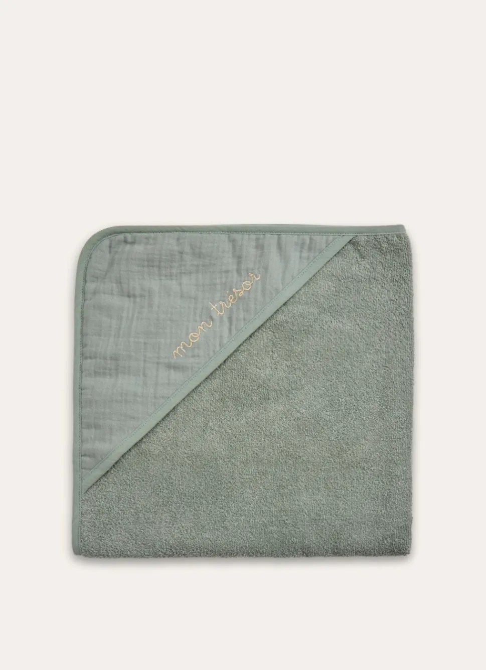 Jolie cape de bain unie en gaze de coton avec broderie « Trésor ». Produit certifié OEKO-TEX®. Dimensions (cm): 75 x 75