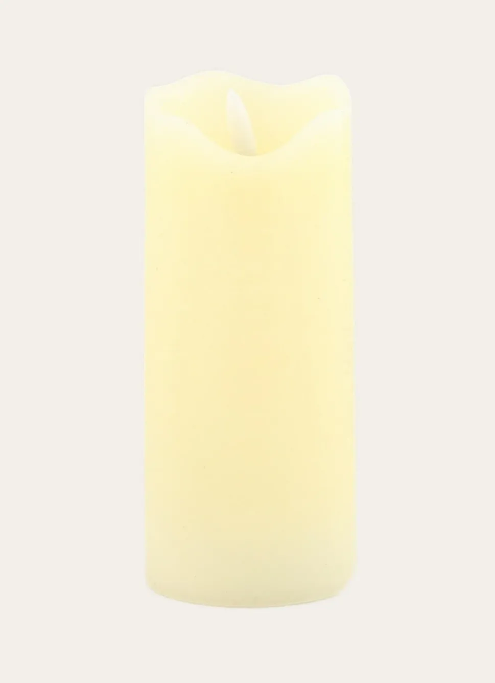Grande bougie cylindrique avec une lumière LED blanche en forme de flamme. Idéal pour apporter une ambiance chaleureuse. Utilisation de 250 heures, ampoule non remplacable. Existe en plusieurs tailles. Dimensions (cm) : H17 x D7